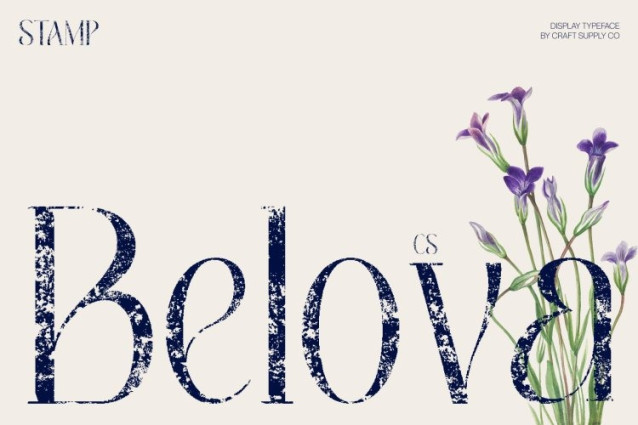 CS Belova Stamp Font This is an elegant serif font crafted with clean, slender lines and enhanced by a distinctive stamp texture. Its balanced structure expresses sophistication and clarity, while the stamped finish introduces a soft vintage character that adds warmth and artistic depth. The result is a typeface that feels polished yet expressive.