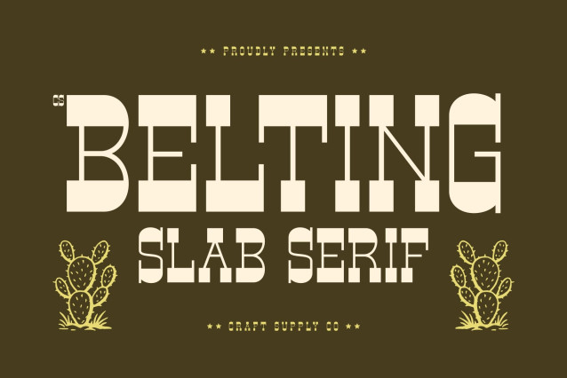 CS Belting Font – This is a bold western display font that channels the untamed spirit of the Wild West. Inspired by classic frontier signage and rugged cowboy culture, this font delivers a strong, confident presence rooted in history and reverse contrast style. Its distinctive slab-like serifs and solid construction evoke the look of wanted posters, and handcrafted wooden lettering.