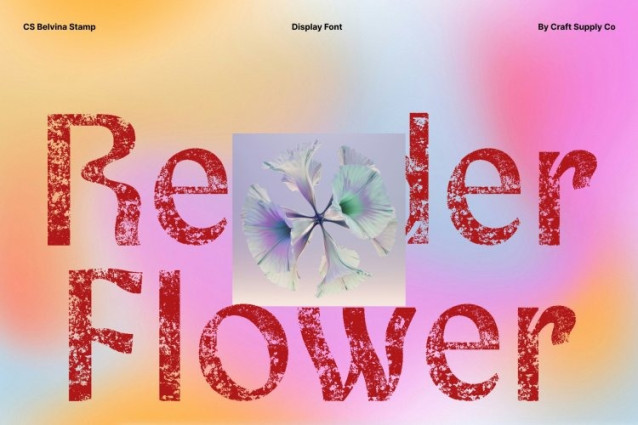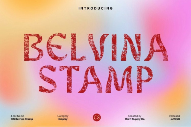 CS Belvina Stamp Font This is a modern display font infused with psychedelic flair and enhanced by a stamped effect that brings an organic, vintage character. Its bold forms and fluid motion create a visually experimental look, while the textured finish adds depth and an artistic, handcrafted feel that elevates its expressive personality.