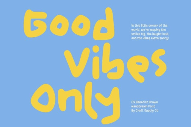 CS Benedict Drawn Font This is a gritty, messy display font designed to capture the spirit of freehand scribbling and joyful imperfection. Its irregular strokes and loose handwritten structure create a raw, expressive look that feels spontaneous and alive. Each letter appears boldly drawn without restraint, celebrating chaos and creativity rather than precision. The result is a font packed with personality, movement, and authentic hand-drawn charm.