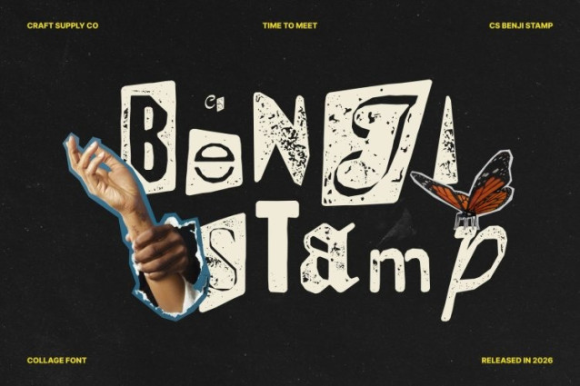 CS Benji Stamp Font This is a distinctive display font inspired by the bold, playful spirit of ransom notes and collage art. Built from an eclectic mix of letterforms, this font embraces visual diversity through varied shapes, textures, and stylistic contrasts. The result is a lively, expressive design that feels spontaneous, artistic, and full of personality perfect for projects that aim to stand out with creative confidence.