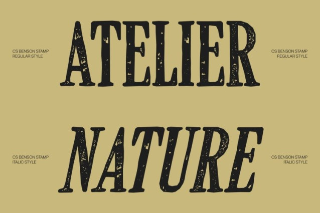 CS Benson Stamp Font This is a modern serif font featuring a clean, slim, and condensed structure, now enriched with a distinctive stamp effect. Its tall, narrow proportions remain space-efficient and elegant, while the stamped texture introduces subtle imperfections that add warmth and character. This blend creates a refined balance between precision and organic charm.