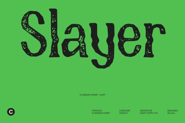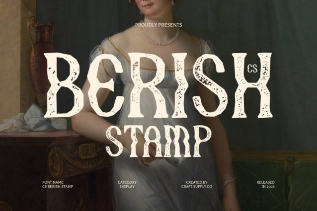 CS Berish Stamp Font This transforms the original psychedelic display serif into a visually rich, textured typeface with a handcrafted stamp effect. Its swirling, undulating letterforms now carry subtle irregularities, distressed edges, and ink-like textures that evoke the charm of retro print techniques, giving the font a nostalgic, tactile character.