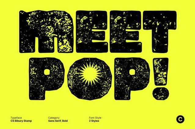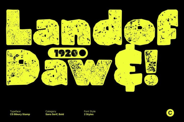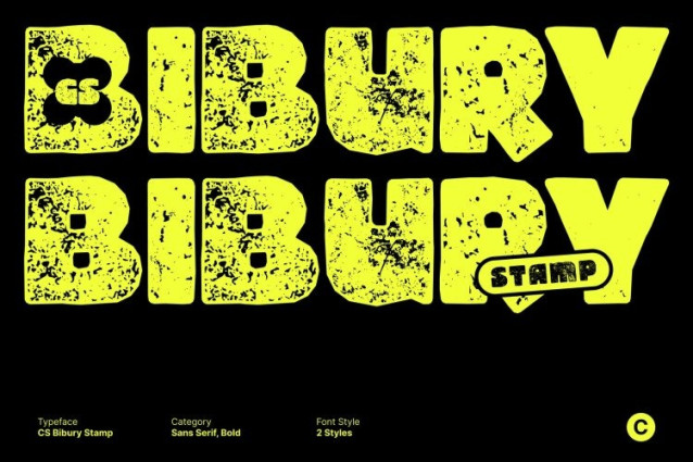 CS Bibury Stamp Font This is a display font that captures the bold spirit of the ’90s through eye-catching shapes and a lively, expressive attitude. Its chunky letterforms and confident curves deliver instant personality and fun. Enhanced with a stamp effect, the font gains textured depth and slightly worn edges, evoking the look of old posters, screen prints, and vintage packaging.