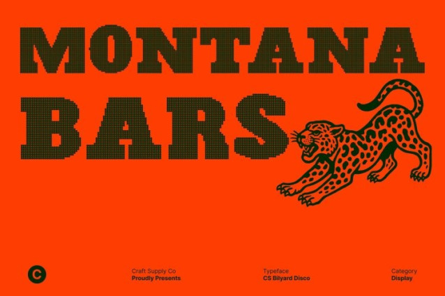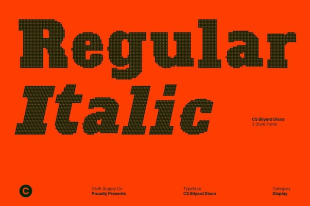 CS Bilyard Disco Font This is a robust slab serif display font inspired by classic retro typography and energized with a disco spirit. Its heavy letterforms and bold slab serifs deliver a strong sense of confidence and heritage, while the disco influence adds a lively, celebratory edge. The result is a typeface that feels powerful, nostalgic, and ready to own the spotlight.