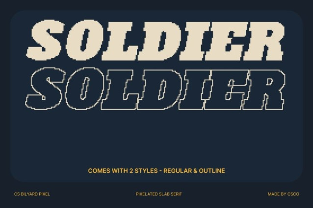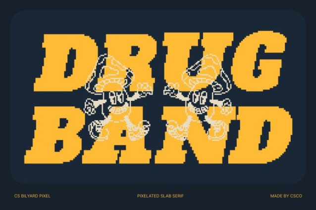 CS Bilyard Pixel Font This is a bold slab serif font inspired by classic retro typography and translated into a striking pixel style. Its solid construction and strong slab serifs evoke a sense of heritage, confidence, and durability, while the pixel detailing adds a digital edge. This combination creates a typeface that feels nostalgic yet relevant, perfect for designs that celebrate the past with a modern visual language.