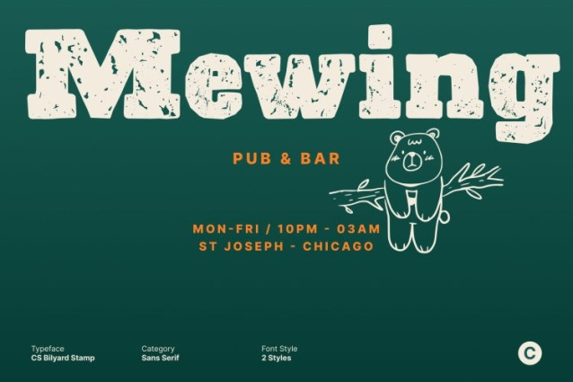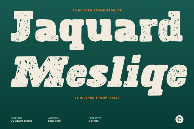 CS Bilyard Stamp Font This is a robust slab serif typeface inspired by classic retro aesthetics and traditional print design. Its sturdy letterforms and distinctive slab serifs convey confidence and heritage. Enhanced with a stamp effect, the font gains textured surfaces and subtle wear, evoking the look of old posters, labels, and vintage signage while maintaining a clean, modern edge.