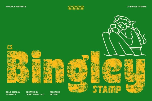 CS Bingley Stamp Font This is a bold sans-serif display font that fuses solid, oversized forms with a playful retro aesthetic now enhanced by a distinctive stamp texture. Its confident weight and chunky proportions create a strong visual presence, while the stamped finish adds a vintage, print-worn character that amplifies its nostalgic charm.