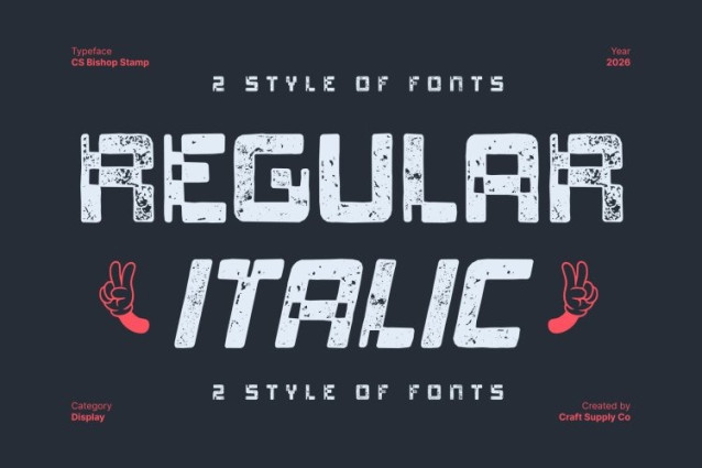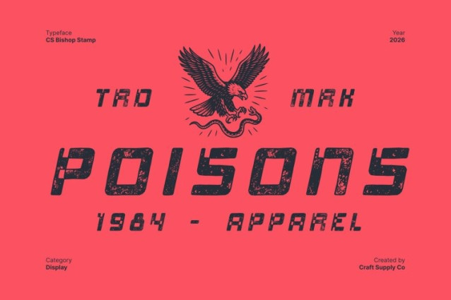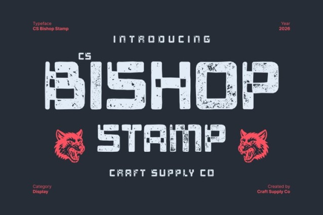 CS Bishop Stamp Font This is a distinctive display font that fuses retro pixel aesthetics with expressive artistic character. Inspired by classic pixel typography, its blocky forms recall early digital screens, arcade games, and vintage computer graphics. This nostalgic foundation is reimagined with a handcrafted sensibility, creating a font that feels both retro and creatively alive.