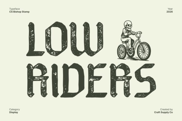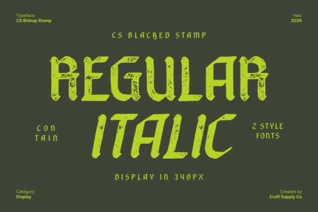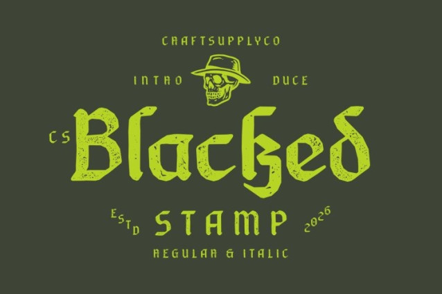CS Blacked Stamp Font This is a striking display serif font rooted in the timeless tradition of Blackletter typography. Featuring intricate structures, sharp angles, and dramatic contrasts, it delivers a strong historical presence. Enhanced with a stamp effect, the font gains textured surfaces and subtle distress, evoking the look of aged manuscripts, old print presses, and traditional stamped lettering.