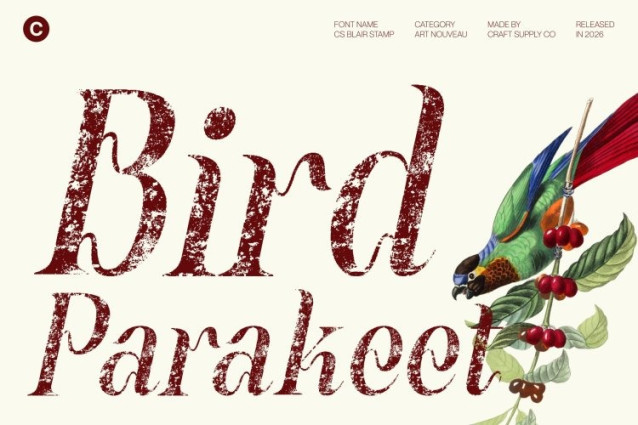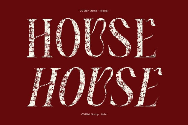 CS Blair Stamp Font This is a refined serif font inspired by the timeless beauty of Art Nouveau, enhanced with a distinctive stamp texture. Its smooth curves, flowing lines, and organic details express elegance and artistic grace, while the stamped finish introduces a subtle vintage depth that evokes classic print craftsmanship.