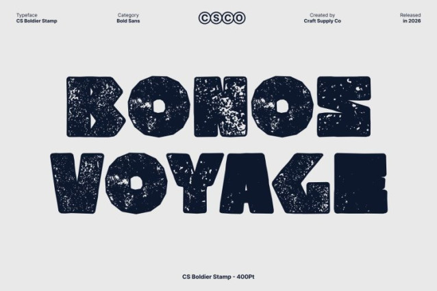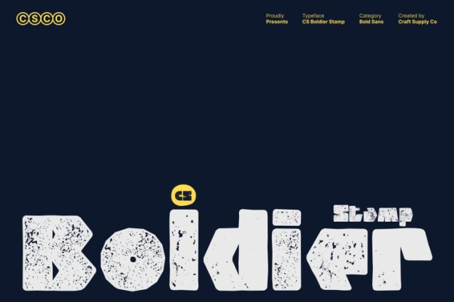 CS Boldier Stamp Font This is a bold display font built with thick, confident strokes and enhanced by a subtle stamped texture. The solid letterforms create immediate visual impact, while the textured finish adds a handcrafted, slightly imperfect edge that brings warmth and character.