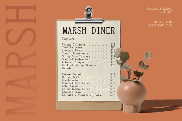 CS Camilo Mono Font is a sophisticated serif font that merges classic design elements with a monospaced and condensed structure. The monospaced feature ensures each character occupies the same width, providing a uniform and technical appearance that enhances readability and organization. The condensed design allows for more text to fit in a narrower space, making it ideal for contexts where space efficiency is crucial.