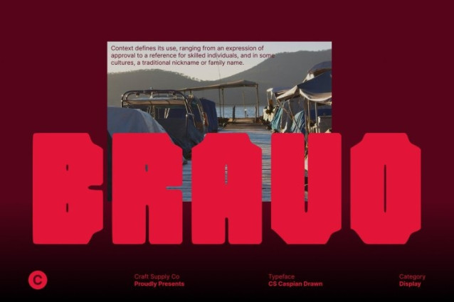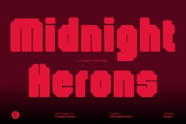 CS Caspian Drawn Font This is a bold industrial-style display font built to convey power, strength, and masculinity. Its sturdy letterforms and solid construction create a commanding visual presence, making it ideal for designs that need to feel tough, confident, and impactful. The overall structure feels raw and purposeful, reflecting an industrial aesthetic that stands out with authority.