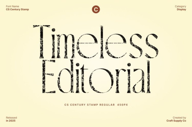 CS Century Stamp Font This font features refined, elongated serif forms that create a tall and sophisticated silhouette. Its sleek proportions give every word a graceful presence, making your designs feel luxurious, polished, and unmistakably classy. This elevated structure adds a sense of elegance that enhances high-end layouts with ease.