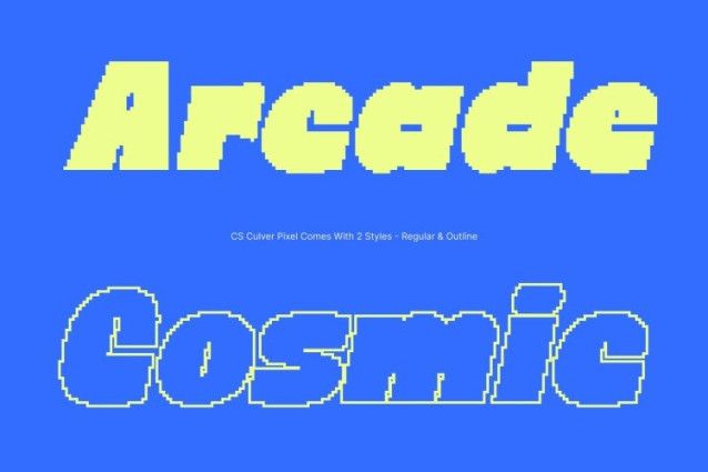 CS Culver Pixel Font This is a bold sans serif display font that blends confident structure with a retro funky spirit, enhanced by pixel detailing. Its chunky letterforms feel energetic and expressive, while the pixel construction adds an old-digital flavor inspired by classic arcade screens and early computer graphics. The result is a typeface that feels playful, bold, and unmistakably eye-catching.