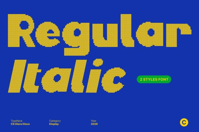 CS Diora Disco Font This is a bold display font built on strong geometric foundations and distinctive character constructions. Its confident, eye-catching letterforms deliver instant impact, making it ideal for titles and headlines that demand attention. Clean structure meets expressive details, creating a modern display font that feels bold, stylish, and full of movement.
