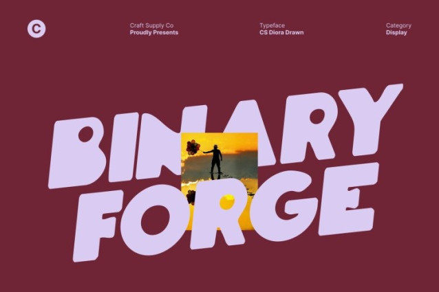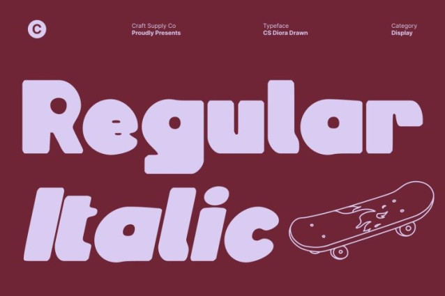 CS Diora Drawn Font This is a bold display font built on strong geometric foundations and distinctive letter constructions. Its confident, solid forms deliver instant visual impact, while the drawn texture adds an organic, handcrafted touch. This blend of structure and spontaneity creates typography that feels modern, expressive, and visually engaging.