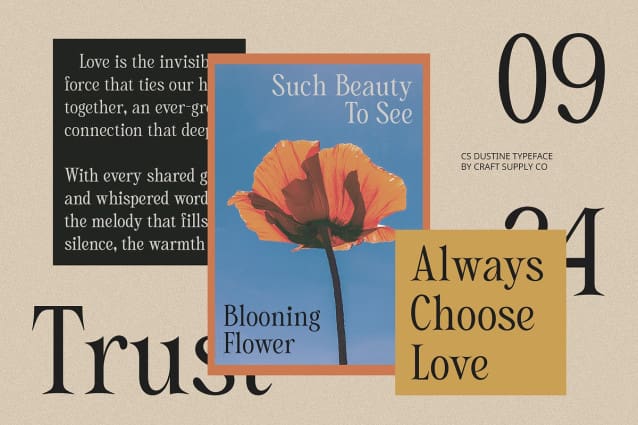 Versatile for Diverse Creative Endeavors Ideal for wedding invitations, editorial layouts, and upscale marketing materials, CS Dustine offers versatility without sacrificing its distinctive character. It provides designers with a tool to express elegance and creativity, ensuring that every project leaves a lasting impression.