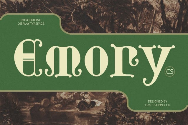 CS Emory is a bold display font that combines the historic charm of uncial script with the dramatic flair of Gothic design. Its rounded, semi-connected letterforms and intricate details create a font that bridges tradition and artistry, offering a bold yet elegant aesthetic.