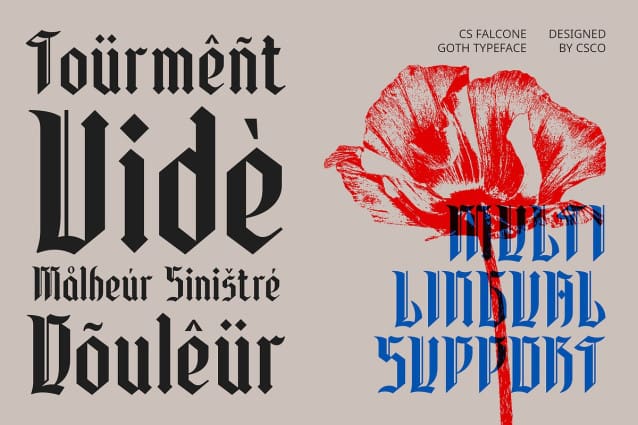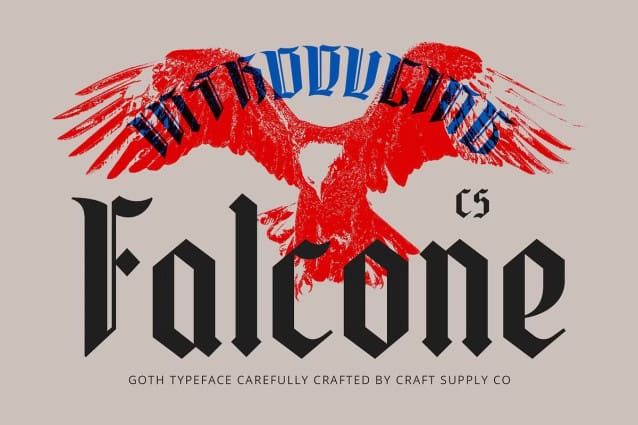 CS Falcone Font is a Gothic display font that captures the essence of medieval art and architecture. Its dark, bold characteristics, sharp forms, and dominant vertical lines create a dramatic and powerful visual impact, ideal for projects aiming to convey a sense of mystery or historical depth.
