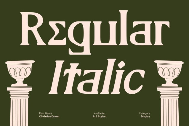 CS Gelios Drawn Font This is a modern display serif font inspired by classic Greek letterforms, blending timeless sophistication with contemporary design. The drawn effect adds subtle handcrafted details, giving each character an artistic, unique presence while preserving its refined, balanced structure.