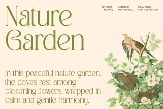 CS Giova Font This is a modern Art Nouveau display font defined by smooth organic lines and graceful movement. Inspired by the flowing aesthetics of classic Art Nouveau and reimagined through a contemporary lens, this font delivers an elegant and fresh visual presence. Its expressive curves and stylish structure create a sophisticated tone that feels artistic, refined, and visually captivating.