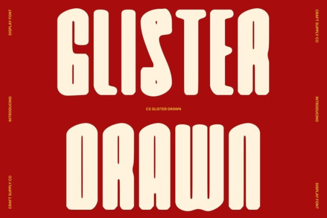 CS Glister Drawn Font This is a modern display sans serif font designed to make a commanding visual statement. Its bold, condensed structure ensures maximum impact in headlines, posters, packaging, and logos, providing a dense yet legible form that dominates any layout. The hand-drawn effect adds texture and personality, giving each letter a handcrafted, expressive quality that enhances its presence without compromising readability.