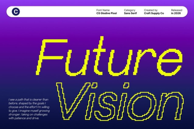 CS Glodive Pixel Font This is a modern sans-serif font that combines clean, minimalist design with subtle pixel detailing, giving it a sleek, contemporary, and slightly retro-digital character. Its precise letterforms exude professionalism while the pixel-inspired accents evoke a sense of modern technology and digital refinement.