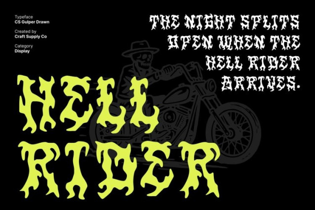 CS Gulper Drawn Font This is a loud and commanding metal display font designed to unleash raw energy in every letter. Its sharp, angular construction mirrors the intensity of heavy metal aesthetics, delivering a fierce visual punch from the first glance. The pointed edges, exaggerated terminals, and aggressive silhouettes translate perfectly into designs that demand boldness and power.