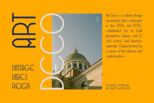 Geometric Precision for Timeless Style With its geometric shapes and precise lines, CS Hazel captures the essence of the Art Deco movement while maintaining a contemporary flair. The characters reflect the opulence of the era, lending a classic feel to your designs. This font is perfect for projects that aim to evoke a sense of timelessness and grandeur, whether used in print or digital media.