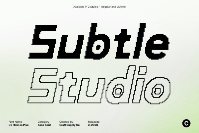 CS Holmes Pixel Font This is a robust sans-serif font that combines a clean industrial aesthetic with subtle pixel detailing. Its geometric forms and strong lines convey modernity, reliability, and professionalism, while the pixel-inspired edges add a retro 8-bit digital touch, giving your designs both a contemporary and nostalgic feel.