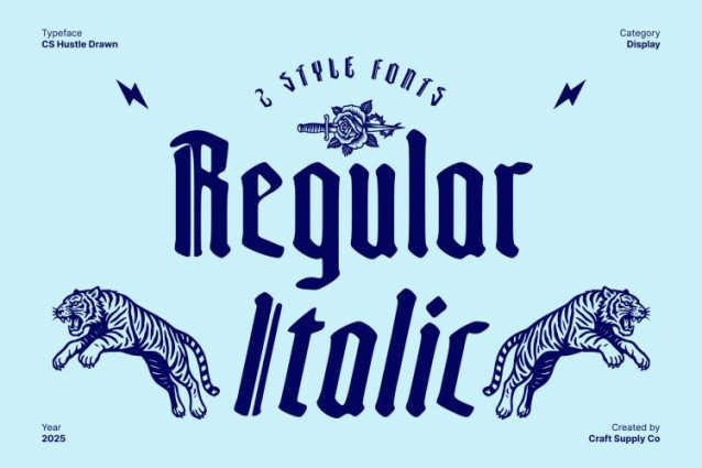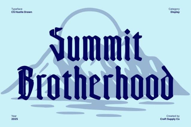 CS Hustle Drawn Font This is a striking display font built on traditional Blackletter shapes, giving it a sense of historical weight and timeless style. Its bold, decorative forms command attention and create a dramatic, classic aesthetic. Each character is carefully crafted to maintain readability while showcasing the intricate beauty of Blackletter typography.