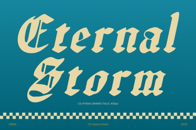 CS Hyena Drawn Font This is a decorative Blackletter font built to make a strong, commanding impression. Its bold, angular strokes convey authority and drama, while the classic Blackletter forms provide a timeless, historic elegance. Each letter captures attention, giving your designs a sophisticated yet edgy feel that resonates with tradition style.