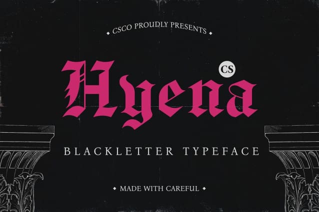 Ideal for Vintage and Heritage Branding CS Hyena is an excellent choice for vintage-themed branding, logos, packaging, and promotional materials. The Old English style lends an air of authority and sophistication, making it ideal for projects that require a nod to the past while retaining modern visual appeal. Whether you are designing for historical-themed events, heritage brands, or classical editorial projects.