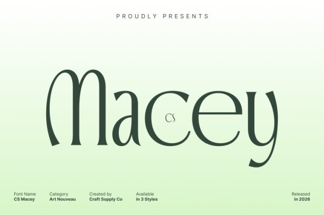 CS Macey Font This is a modern Art Nouveau display font defined by smooth organic lines and graceful movement. Inspired by the flowing beauty of classic Art Nouveau design and reinterpreted with a contemporary sensibility, this font delivers an elegant and fresh visual presence. Its refined curves and harmonious structure create a sophisticated aesthetic that feels artistic, stylish, and timeless.