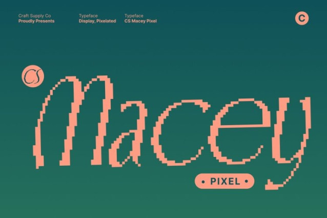 CS Macey Pixel Font This is a modern Art Nouveau-inspired display font that blends smooth, organic lines with subtle pixel detailing. Its graceful curves and flowing letterforms exude elegance and sophistication, while the digital accents add a contemporary edge. The result is a font that feels artistic, stylish, and perfectly suited for premium design applications.