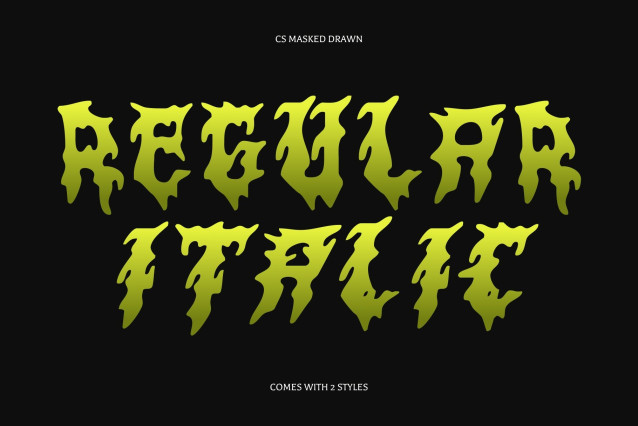 CS Masked Drawn Font – This is a raw black metal display font forged from darkness, aggression, and extreme intensity. Enhanced with a brutal hand-drawn effect, each letter feels violently scratched and instinctive, as if carved through pure emotion. Its jagged forms and chaotic strokes create a ruthless visual language that represents rebellion, power, and uncompromising force.