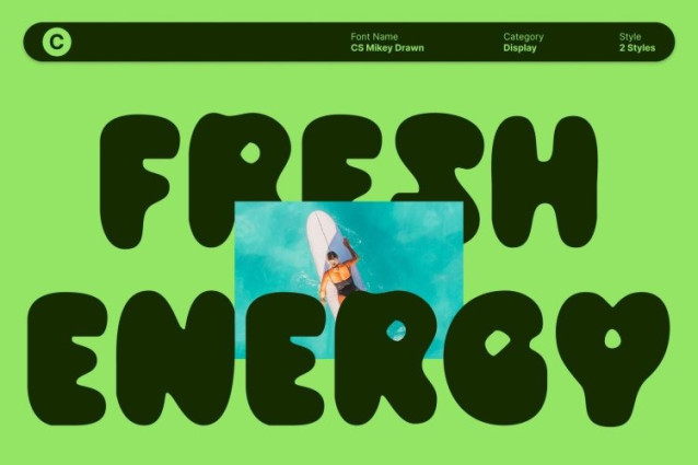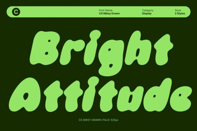 CS Mikey Drawn Font This is a modern bubble display font designed to deliver pure fun, friendliness, and expressive charm. Built with bold, rounded letterforms and soft edges, this typeface feels inflated with personality and warmth. The added hand-drawn texture enhances its playful nature, giving each character a lively, organic quality that feels approachable, cheerful, and full of energy.