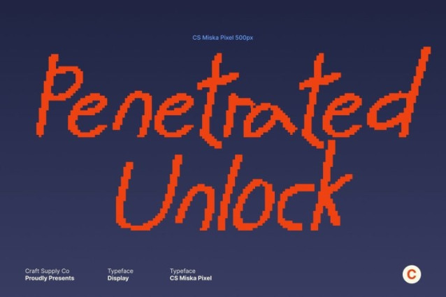 With its unrestrained, expressive style, this font injects movement and attitude into any layout. The combination of scribbly strokes and pixel grit turns ordinary text into bold, engaging visuals great for party invitations, kids’ artwork, and fun editorial designs.