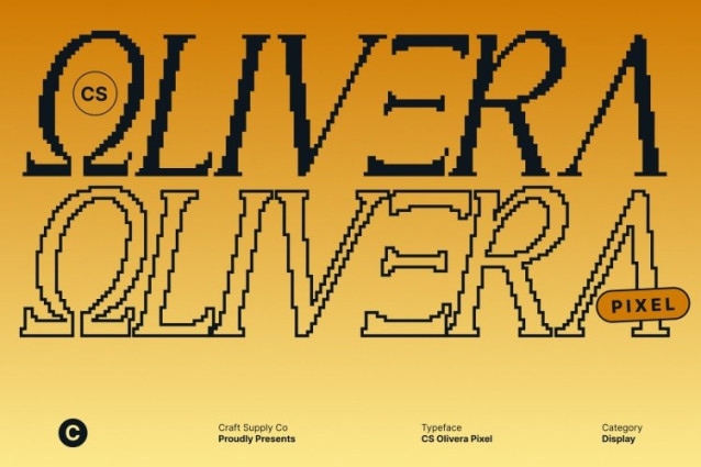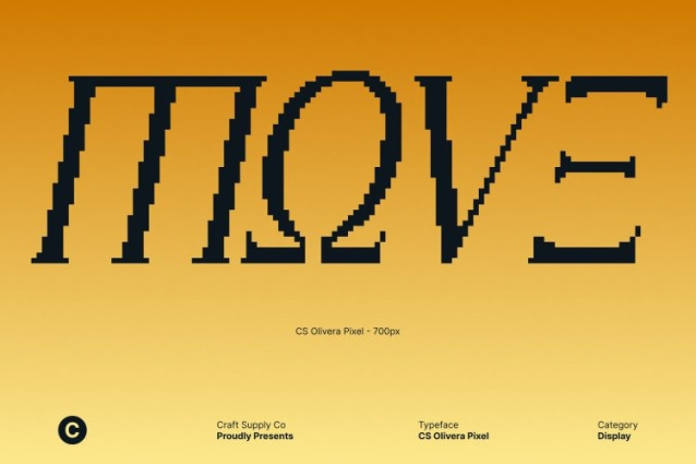 CS Olivera Pixel Font This transforms the refined Greek-inspired serifs of the original font into sharp, pixel-perfect forms. Each letter preserves the elegance and balance of historical inscriptions while gaining a crisp, blocky digital structure that makes it instantly readable on screens and retro-styled visuals.