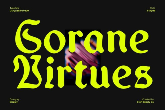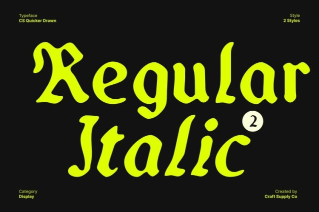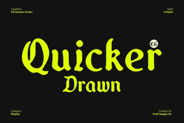 CS Quicker Drawn Font – This is a Gothic display font defined by sharp, bold letterforms that deliver a strong and commanding presence. Its angular construction and solid weight draw inspiration from classic Gothic typography, creating a powerful visual identity rooted in tradition and strength.