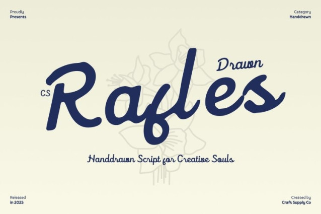 CS Rafles Drawn Font This is a modern script font that combines smooth, flowing cursive forms with a subtle hand-drawn texture. Each stroke is carefully crafted to evoke elegance and charm, merging the natural beauty of handwriting with a refined contemporary aesthetic. The result is a timeless, polished typeface that feels both sophisticated and approachable.