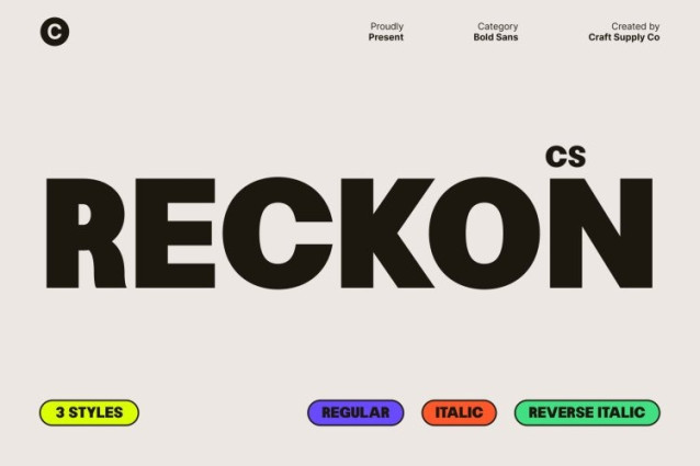CS Reckon Font This is a bold sans serif font designed to stand out with confidence. Its strong, clean shapes establish a sense of stability and clarity, while subtle funky detailing adds a refreshing twist. This blend of structure and playfulness gives the font a distinctive voice ideal for designers seeking a modern typeface with expressive personality.