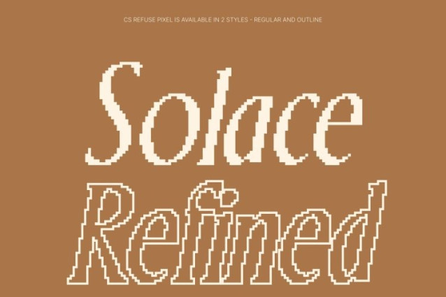 CS Refuse Pixel Font This is a refined serif font that combines contemporary elegance with a distinctive pixel construction. Designed to deliver a sleek and high-end visual impression, it features elegant curves and elongated details reimagined through a digital, pixel-based structure. The result is a sophisticated silhouette that feels modern, polished, and subtly nostalgic perfect for designs that blend luxury with technology.