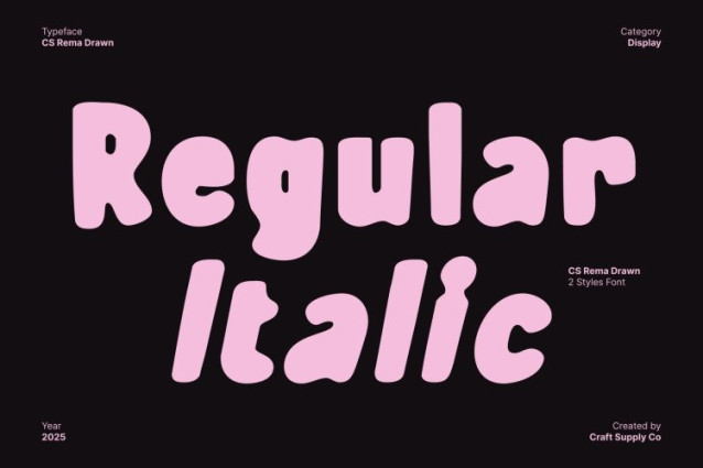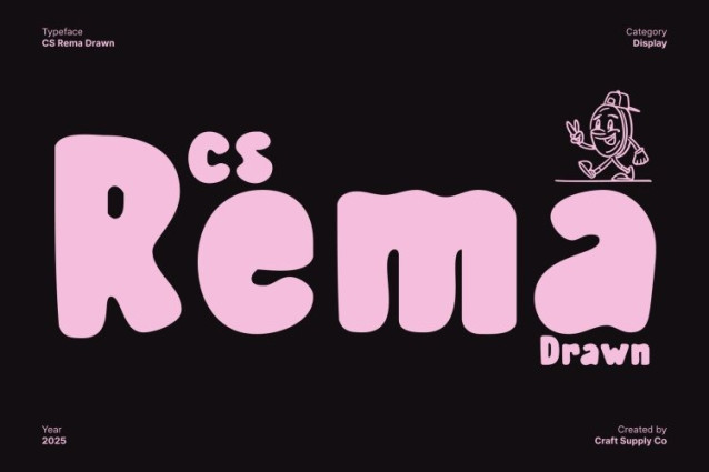 CS Rema Drawn Font Playful and energetic, this fun display font set features bold strokes and friendly shapes that instantly create a cheerful and approachable impression. Its rounded proportions and expressive forms bring a sense of movement and happiness, making every word feel alive, youthful, and full of personality. The font is designed to communicate warmth and positivity at first glance.