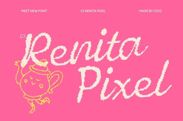 CS Renita Pixel Font This is a graceful script font inspired by natural handwriting and refined through a subtle pixel construction. Its flowing strokes and elegant curves retain a soft, personal feel, while the pixel structure introduces a distinctive digital texture. This blend creates typography that feels warm and expressive, yet visually unique and modern.