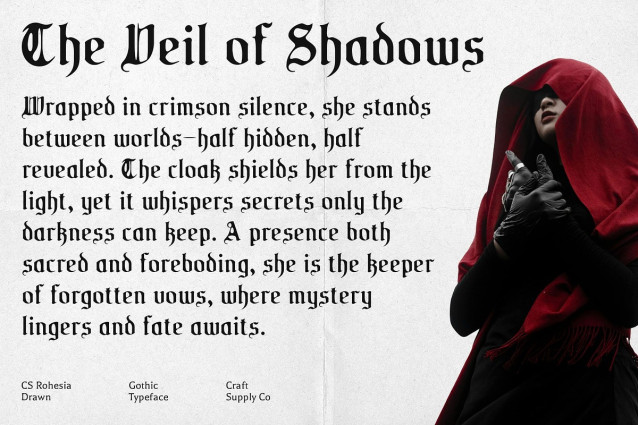 CS Rohesia Drawn Font is a display font featuring bold, elegant letterforms inspired by classic Gothic typography. Its sharp, decorative lines evoke sophistication, tradition, and a timeless sense of style, perfect for designs with a dramatic impact.