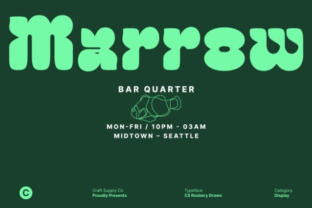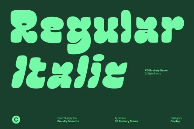 CS Rosbery Drawn Font This is a bold and eye-catching display font that combines strong weight with playful, floral-inspired shapes. Its striking forms demand attention, making it ideal for designers seeking typography that stands out in headlines, posters, and branding projects. The unique combination of bold structure and whimsical curves creates a visually dynamic and fun aesthetic.