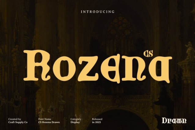 CS Rozena Drawn Font This is a display font built on classic uncial letterforms, featuring gracefully curved shapes inspired by historical manuscripts. Its design evokes a sense of tradition, authority, and timeless elegance, making it perfect for projects that require a sophisticated and historically informed typographic presence.